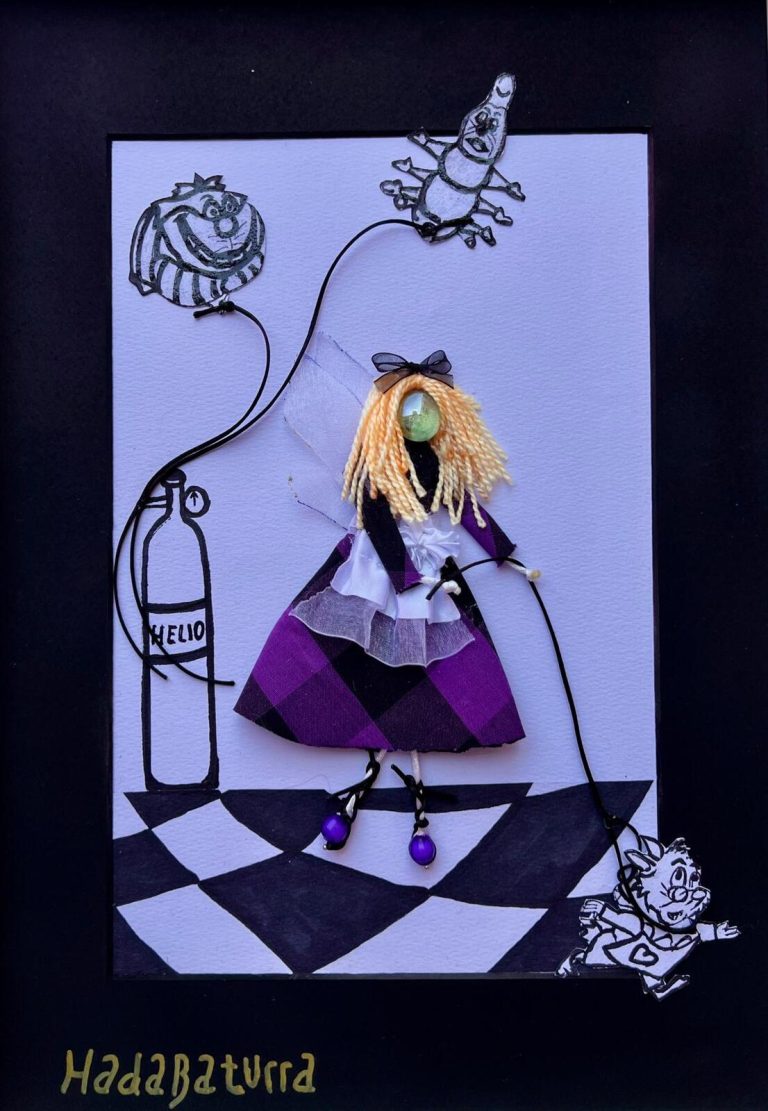Cada obra nace como un collage donde el dibujo con tinta china se mezcla con telas de cachirulo,materiales reciclados y otros elementos textiles que dan vida a figuras mágicas.